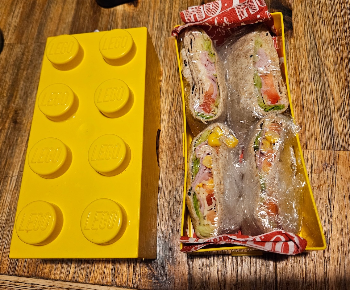 In Butterbrotpapier oder Frischhaltefolie gewickelt passt er perfekt in die LEGO Lunchbox. Kein Auslaufen, kein Zerdrücken, kein Stress.